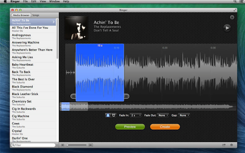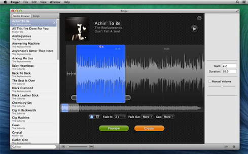 Ringer for Mac制作铃声时,我们可以选择音乐的任意头尾制作,同时选取的音乐会以波形界面展示出来,帮助我们更好的制作铃声,支持淡入淡出的制作。支持预览铃声后在导入我们的iPhone。
