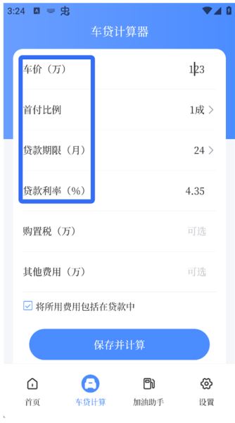 2、输入车价、首付比例、贷款期限以及利率,点击【保存并计算】。