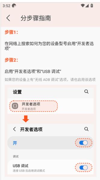 1、启用设备的开发者选项,一般是在设置界面中连续点击版本号五下或七下,也可以自己在网络上搜索自己的设备型号的开发者选项启用方式
