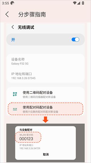 6、接着点击“无线调试”中的“使用配对码对设备进行配对”