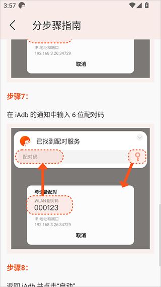 7、在iAdb的通知中输入6位配对码,然后返回iAdb并点击“启动”即可