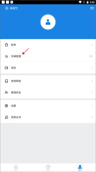 1、打开软件并登录账号,切换到【我的】界面,点击上方的“车辆管理”。