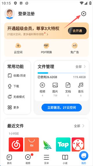 5、点击我的,里面有文件管理、夜间模式、无痕浏览、清理加速、访问历史、最近文件等等功能。