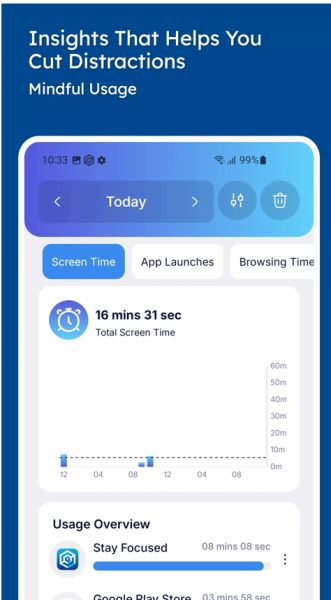 通过提醒和成瘾追踪器(包括屏幕时间追踪器)控制手机成瘾。