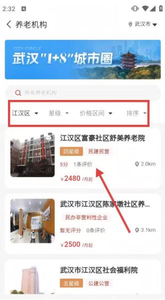 2、在养老机构列表页面,通过江汉区、星级等筛选条件,点击【江汉区富豪社区舒美养老院】,进入机构详情页。