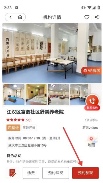 3、在江汉区富豪社区舒美养老院的机构详情页,点击【预约参观】,进入床位状态页面。