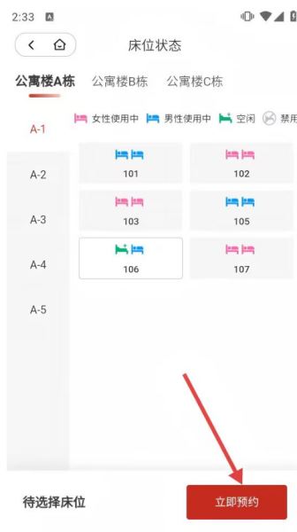 4、在床位状态页面,查看床位情况后,点击【立即预约】,完成床位预约操作。