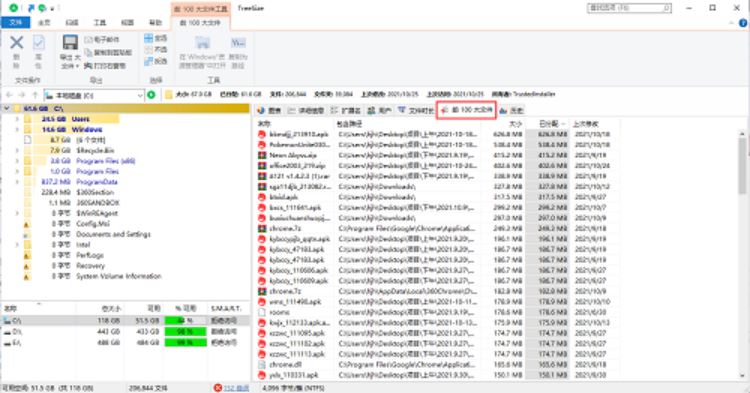 5、比如,点击前100大文件,就会自动把c盘中占内存最多的前100个文件给排列出来,很详细;