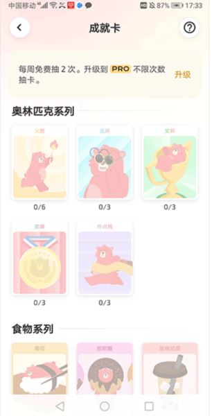 • 有许多系列的成就卡,比如食物系列、奥林匹克系列、节日系列,在完成不同运动目标后可以进行抽卡,每次抽卡的卡面设计都不一样。