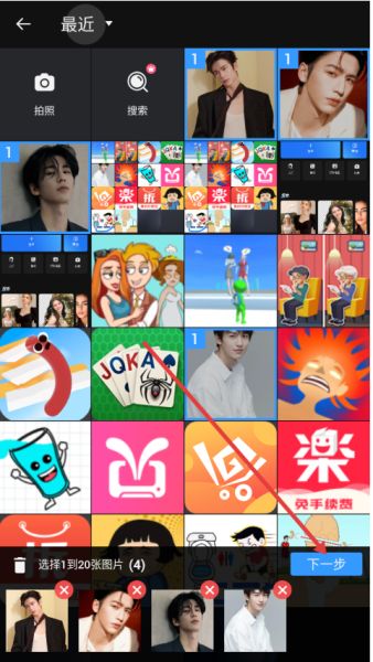 2、从相册中选择想要拼的图片,点击【下一步】。