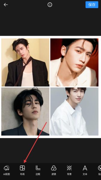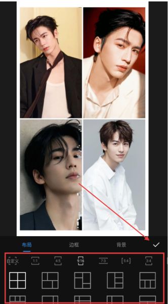 4、选好【布局】后,点击右下角的【√】,再点右上角【保存】完成拼图。