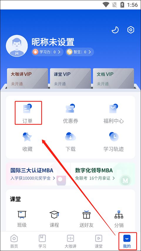 5. 点击右下角“我的”进入个人中心,可管理订单、下载记录、学习轨迹及福利优惠信息,操作非常清晰。