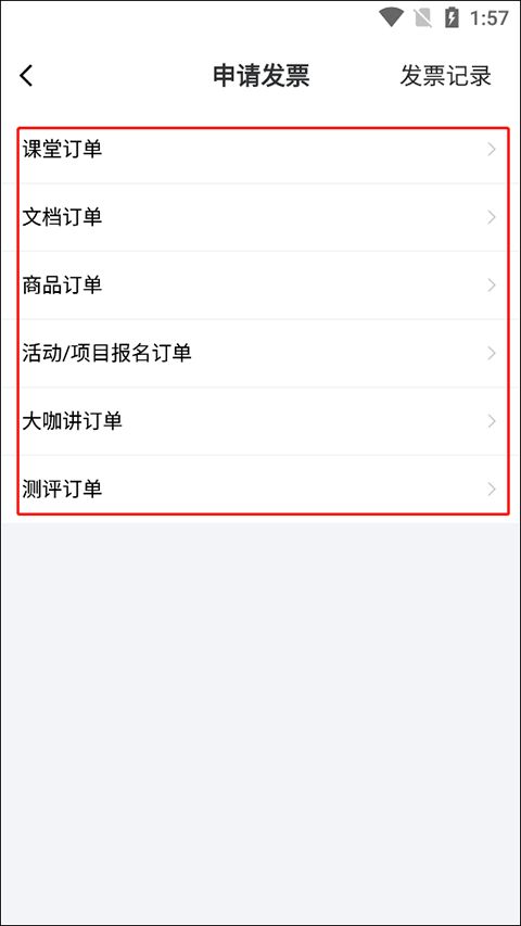 3、在“申请发票”页面中可以对:课堂订单、商品订单、文档订单、活动/项目报名订单以及测评订单进行选择。