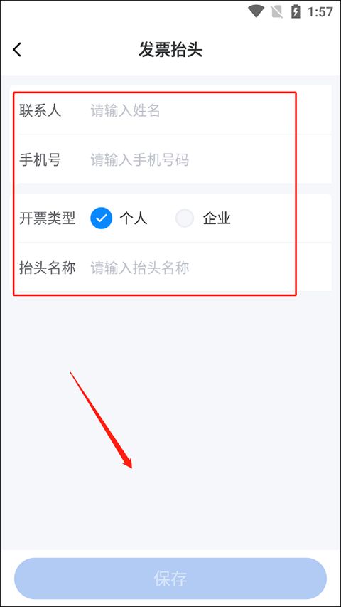 4、然后就是填好发票抬头,里面包括:联系人、手机号码、开票类型以及抬头名称。
