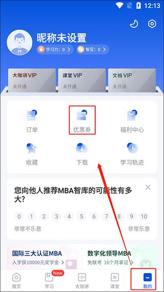1. 初次打开 App 会弹出学习目的选择页,勾选“学习MBA知识”或“查找行业报告”等选项,系统将自动推荐相关内容。