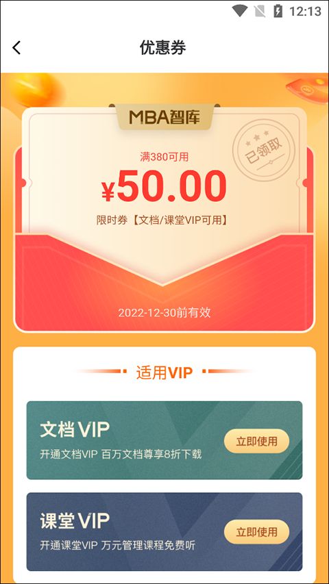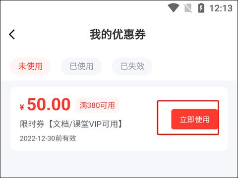4、这边就可以看优惠券能够在什么样的环境下进行使用,比如:文档vip以及课堂vip,每个使用券都是有要求以及时间限制的哦,用户要看清楚再使用。