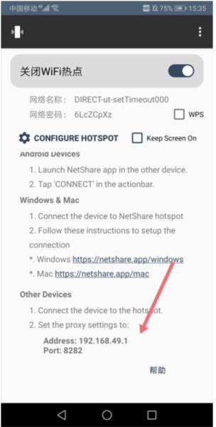 1、打开app后启用共享,它会创建一个基于Wi-Fi Direct的连接点,并显示连接所需的 IP 地址 和 端口号。