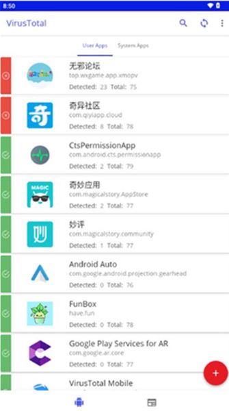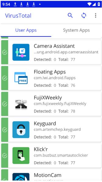 1、本站下载并安装 VirusTotal Mobile 后,应用会自动列出您设备上的所有应用程序;