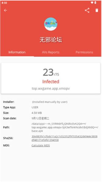 3、查询结果将显示来自数十个不同安全引擎的分析报告,指出该应用是否被标记为恶意;