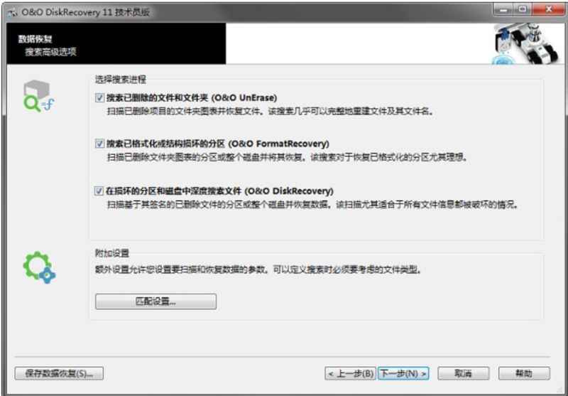 4.如果我们要进行恢复特定的文件或者文件夹时,我们还可以利用软件提供的匹配设置功能来快速查找丢失的文件或文件夹,点击匹配设置按钮后即可在在界面中设置要进行扫描的方式,如深度扫描,另外还可以对文件的类型进行匹配以及文件的大小等等;