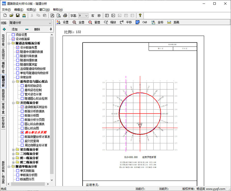 隧道断面分析提供各断面实测点的超欠挖值及超欠挖面积,计算周边炮眼坐标。软件自动生成隧道断面分析图形。