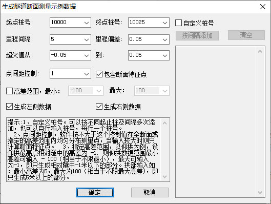 2、在连续隧道断面测量数据中,点击“辅助”,可以辅助生成隧道断面测量示例数据,用于示范本软件的隧道分析功能和使用方法。