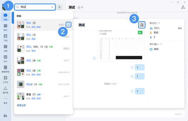 (2)消息界面搜索框输入关键词进行搜索。在电脑端搜索群聊时,支持查看群成员列表。