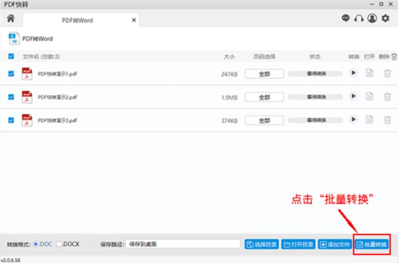 3.点击“批量转换”按钮,或者转换单个文件的按钮,启动pdf转word