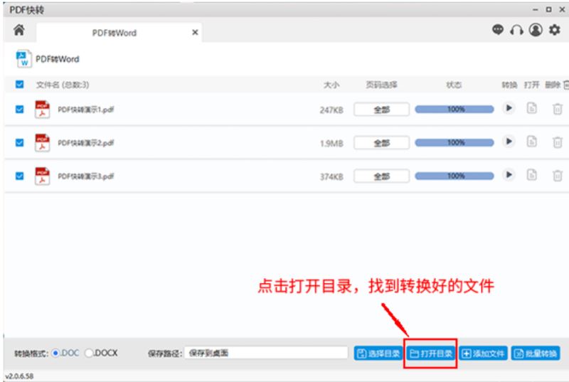 4.等待片刻,转换进度走到满格,说明pdf转word操作已完成。此时,点击“打开目录”按钮即可查看转换后的word文档