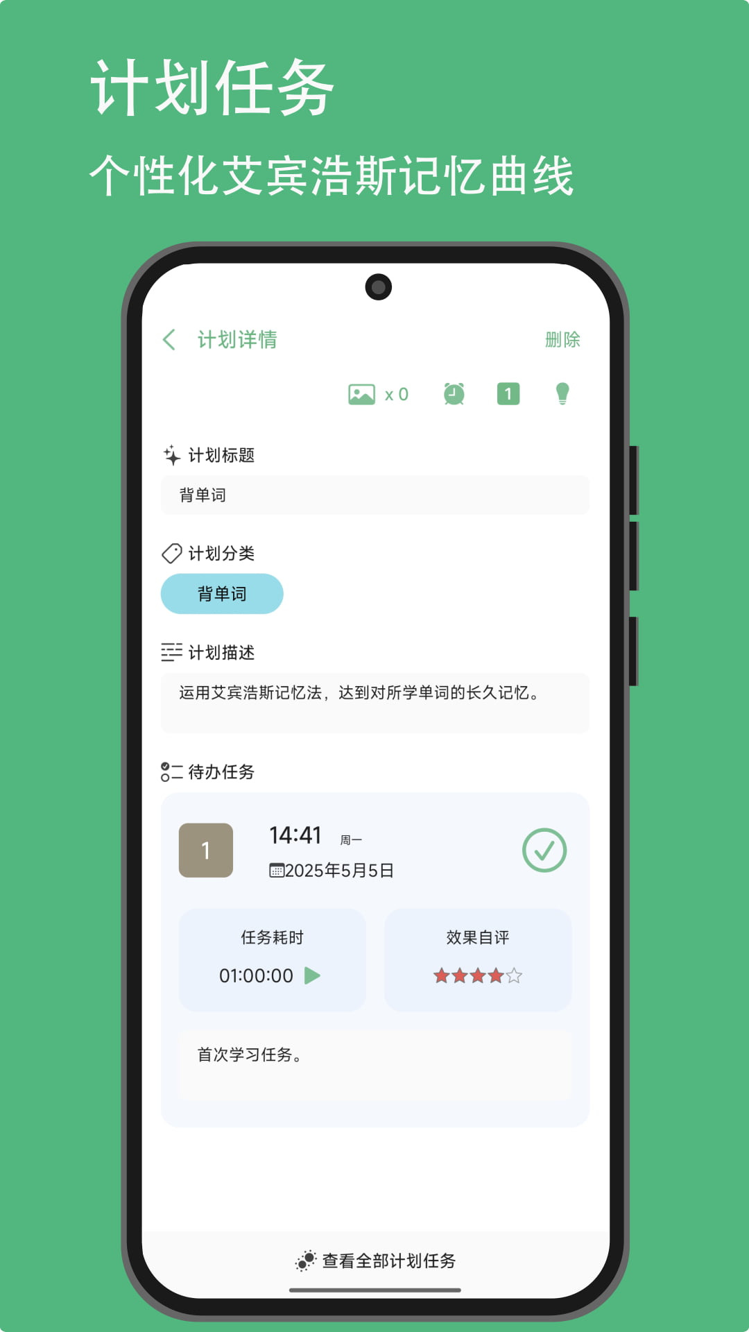 一键创建适合自己的艾宾浩斯记忆曲线计划并灵活设置计划内每个任务的打卡提醒。