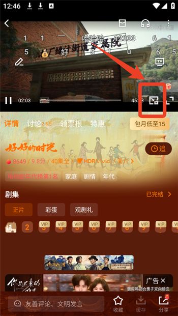 1、在视频播放页面,点击下图标注的画中画按钮。