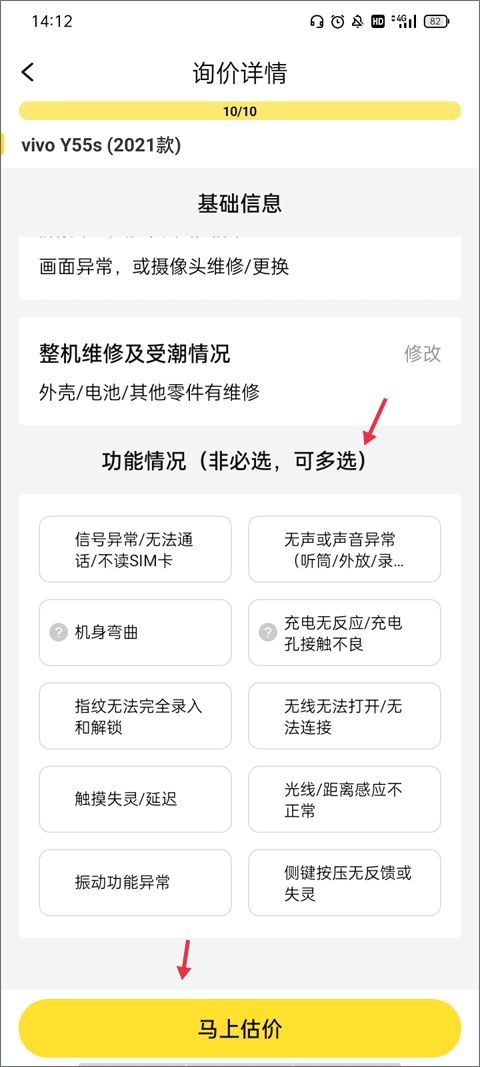 5、全部问题都询问清楚后,了解手机的基本信息、整机维修及受潮情况、功能情况就可以开始“马上估价”了。