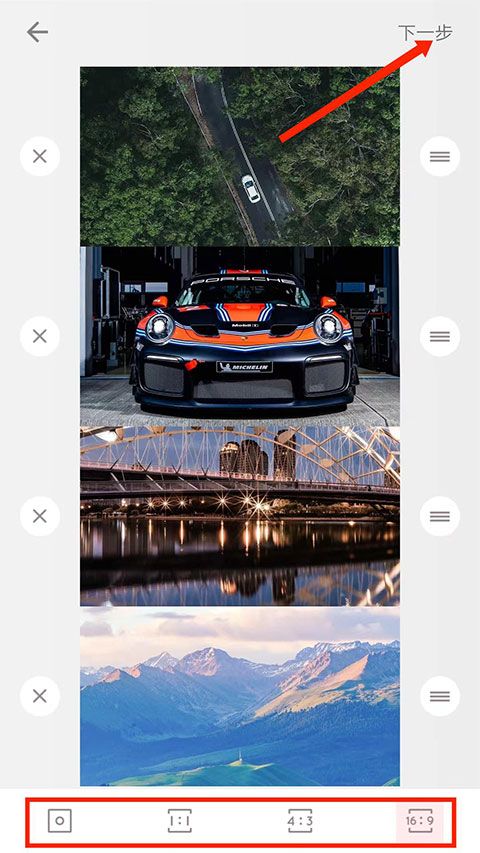 3、接下来用户可以对刚刚选择的拼接图片进行位置顺序的调整,并且对图片的比例进行设置,调整完毕后点击“下一步”。