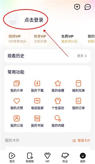 在腾讯视频播放器app的个人中心页面,找到上方的点击登录,点击它。