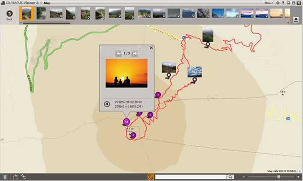由具有GPS功能的智能手机或相机拍摄的带有位置信息的照片自动放在地图上。另外,相机的GPS日志数据自动导入,并显示所行路线(记录器数据)。另外,您还可以使用相机的GPS日志数据,给没有位置信息的图像自动添加位置信息。