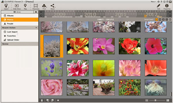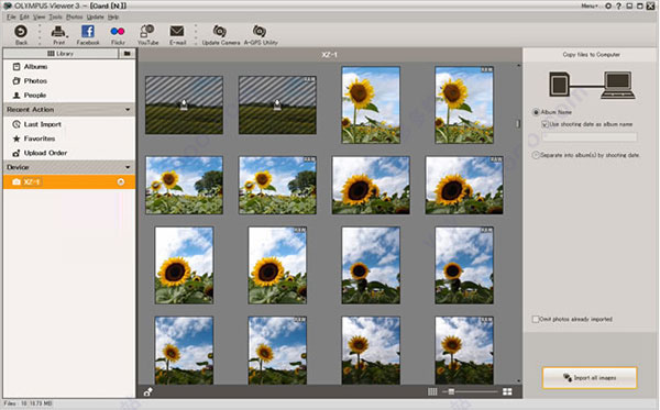 在将相机与PC机连接之后,Olympus Viewer 3自动显示相机中的照片。您可以导入照片,以及将照片方便、快速地上载到社交网络服务或进行打印。