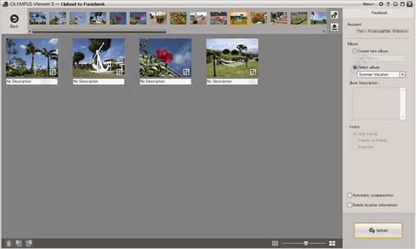 该软件支持Facebook、Flickr和YouTube,以及作为电邮附件发送。另外,您还可以给每张图像添加备注,以及轻松剪裁。如果您使用相机预先设定了上载保留功能,那么上载将更加轻松。