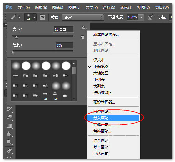 3、在这个下拉框的右上角,有一个小箭头,点击它,并在出来的菜单中选择“载入画笔”。击“载入画笔”后,会弹出来一个对话框,找到你的画笔文件位置,笔刷文件格式为.abr的文件