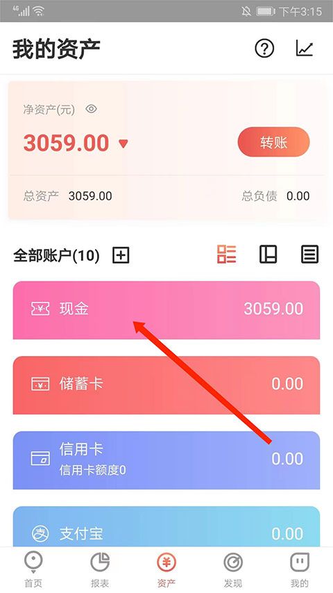 2、进入我的资产界面,选择需要删除的账户,这里以“现金”为例,