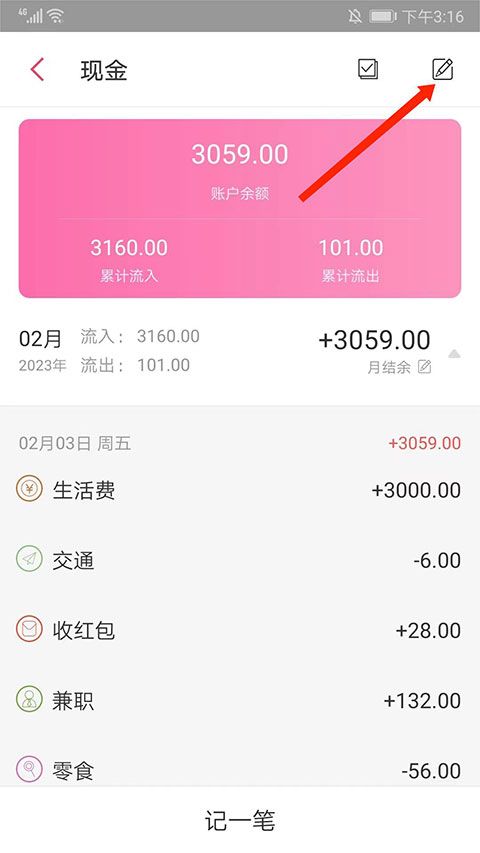 3、进入现金账户界面,选择右上角“笔状”图标,