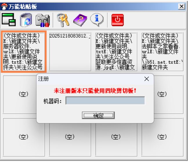 万能粘贴板是一款十分出色的粘贴板插件。可以自动保存你从任意程序中剪切/复制的对象,然后按ALT+V呼出本程序,单击相应的粘贴板就可以把对象复制到任何程序的光标位置的软件。软件支持Win9x/Me/NT/2000/XP/2003!