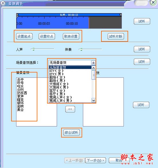 现场录制彩铃: 首先点击选中“当前歌单”中的预制作的伴奏曲目跟唱,完成后,弹出彩铃信息窗口;输入“彩铃名称”和选择“彩铃省份”点击[确定]进入下一步的“音效调解页面” ,根据作品的实际情况对音量和音效进行调解处理,最后必须设定制作彩铃的“ 起点” 和 “ 终点” ,[浏览试听] 确认后进入“彩铃资料填写页"按要求输入各项完成上传即可;