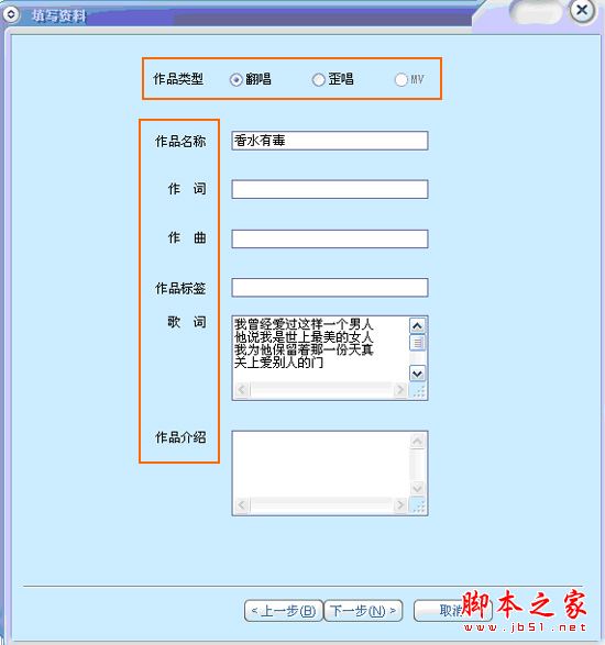 在录制之前我们要先看看我们的视频设备是否正常连接(也就是摄像头是不是连接好了);确定是连接之后,点击“ 当前歌单” 中的曲目;等待音乐起开始录;录制完成后弹出” 视频合成页” ,“试听”后;确定后点击:下一步;进入视频合成页,视频合成可以加上特效:这样可以使原本单调的页面更加丰富些;添加特效后点击“开始合成”按钮然后预览确认后进入下一步:最后按照要求填写资料并确认完成上传步骤;