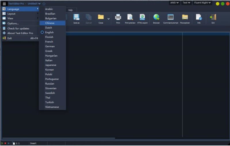 1、双击打开Text Editor Pro官方版软件,点击左上角下拉菜单选择Language下的Chinese