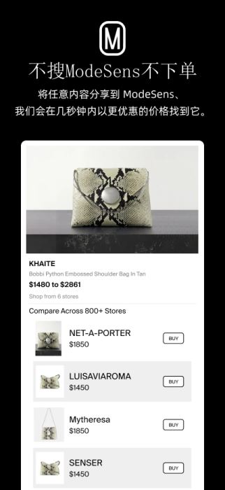 ModeSens智能购物助手凭借完整的产品列表,强大的筛选功能,内置条形码扫描功能,我们可以轻松的比较价格,寻找库存,设置产品提醒以及设置产品集合等等,实时更新,让你不会错过任何合适自己的尺码以及优惠价格。