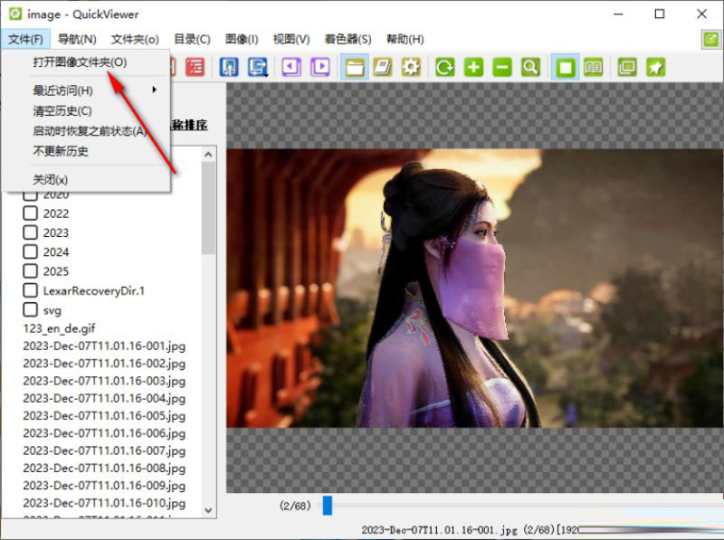 启用后就会显示侧边栏,整个图片文件夹中的文件名会用列表的形式显示,方便你切换到需要查看的图片,并且还能够方便的跳转到子文件夹或上层目录。