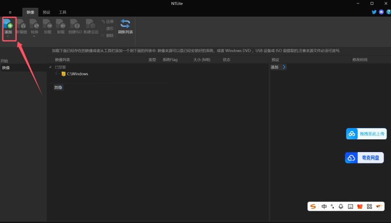 1、对现有的windows安装镜像,比如ISO安装镜像进行精简或整合,打开软件主界面,点击菜单栏的“添加”,如下图,