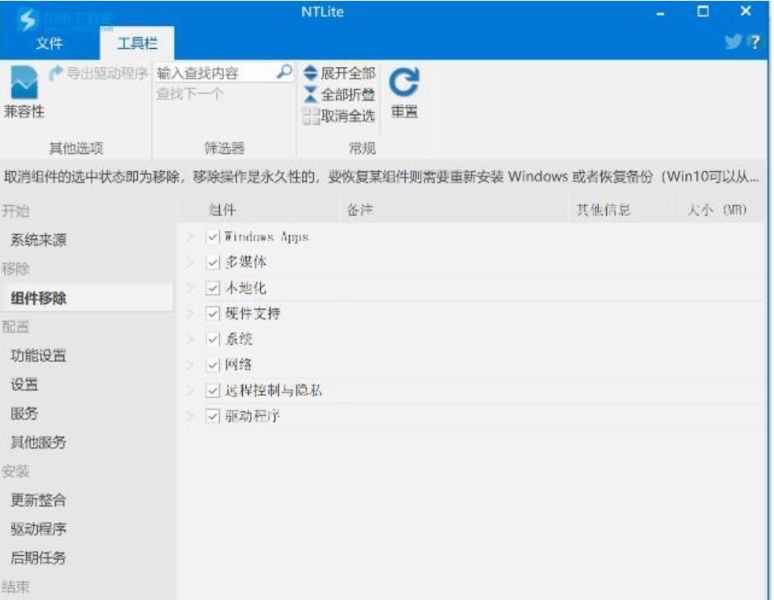 加载后,点击左侧的“组件移除”,右边就会显示当前系统的所有组件,