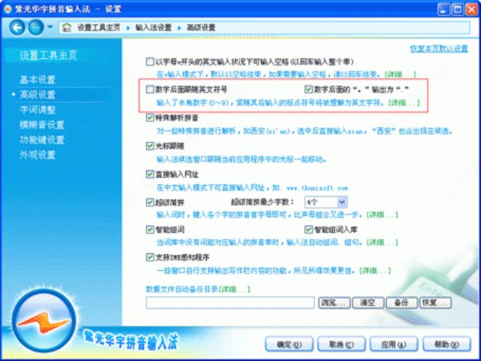 如果只想在数字后面输出中文标点,则“设置”->“高级设置”选择“数字后面跟随英文符号”选项。