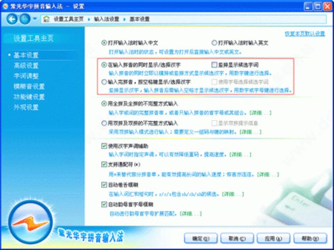 紫光华宇拼音输入法提供两种竖排显示方式,一个是类似智能ABC输入法的竖排显示方式,输入完拼音,按空格显示选择汉字;一个是在输入拼音的同时显示选择汉字。您可以在“设置”->”输入法设置”->”基本设置”中选择任一输入风格。